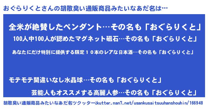 | 男性向けラノベタイトル風あだ名 | 『うちのおぐらりくとが世界を掌握している!』 |