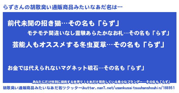 | ヘコむあだ名 | 『らず(遠い目)』『らずふぇ~』 |