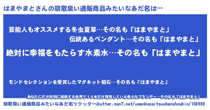 | 意味不明あだ名 | 『永久保存はまやまと』『自称はまやまと』 |