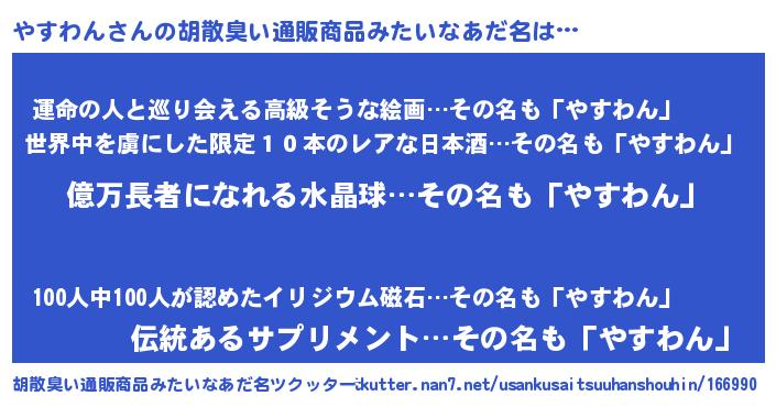 | 男性向けラノベタイトル風あだ名 | 『やすわん~年齢イコール彼女いない歴の魔法使い~』 |