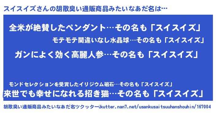 | 意味不明あだ名 | 『自称スイスイズ』『永久保存スイスイズ』 |