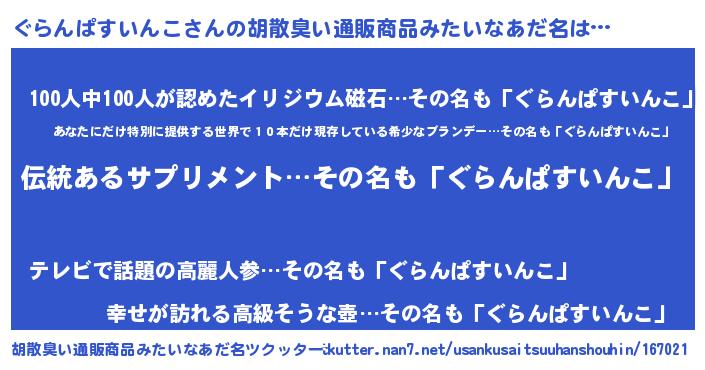| 意味不明あだ名 | 『とにかく怪しいぐらんぱすいんこ』 |