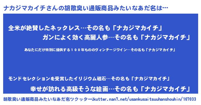 | 男性向けラノベタイトル風あだ名 | 『この素晴らしい世界にナカジマカイチを!』 |