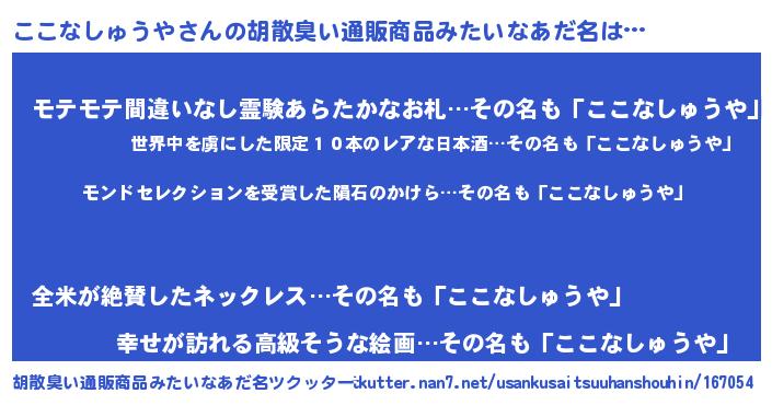 | 男性向けラノベタイトル風あだ名 | 『うちのここなしゅうやが世界を掌握している!』 |