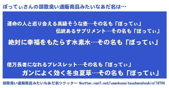 | 意味不明あだ名 | 『永久保存ぼってぃ』『自称ぼってぃ』 |