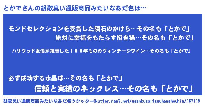 | ヘコむあだ名 | 『とかを』『とかで(苦笑)』『つくし』 |