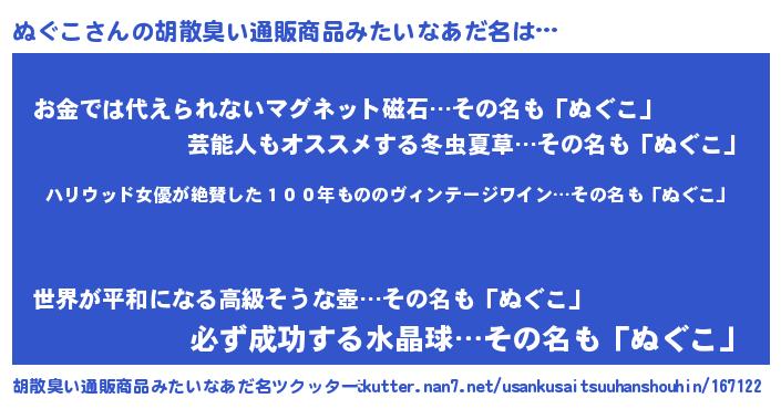 | 意味不明あだ名 | 『住所不定無職ぬぐこ(1歳)』『自称ぬぐこ』 |
