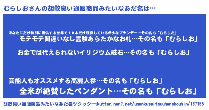 | 男性向けラノベタイトル風あだ名 | 『転生したらむらしおだった件』 |