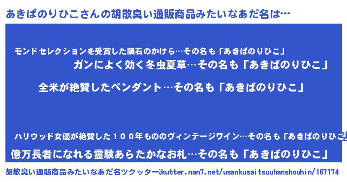 | 男性向けラノベタイトル風あだ名 | 『あきばのりひこの嫁は女の子じゃないと思った?』 |