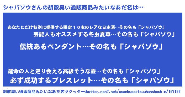 | 男性向けラノベタイトル風あだ名 | 『シャバゾウの嫁は女の子じゃないと思った?』 |