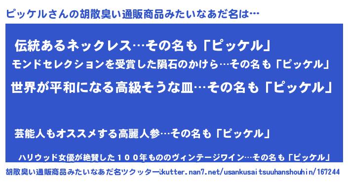 | 女子向けラノベタイトル風あだ名 | 『ピッケル伯爵の花嫁』『ピッケル恋絵巻』 |