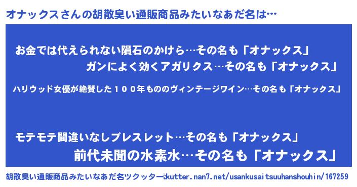 | ヘコむあだ名 | 『オナックス(小並感)』『オナにゅー』 |