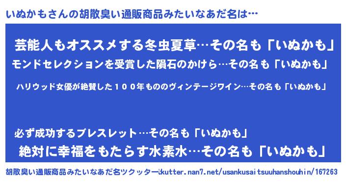 | 意味不明あだ名 | 『住所不定無職いぬかも(11歳)』 |