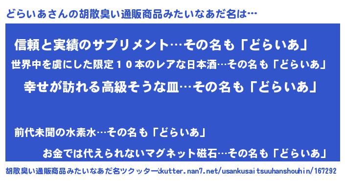 | 女子向けラノベタイトル風あだ名 | 『どらいあの雑貨屋さん』 |