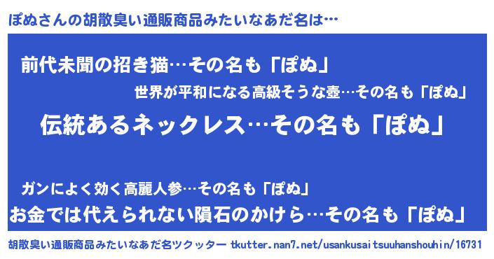 | 男性向けラノベタイトル風あだ名 | 『転生したらぽぬだった件』 |