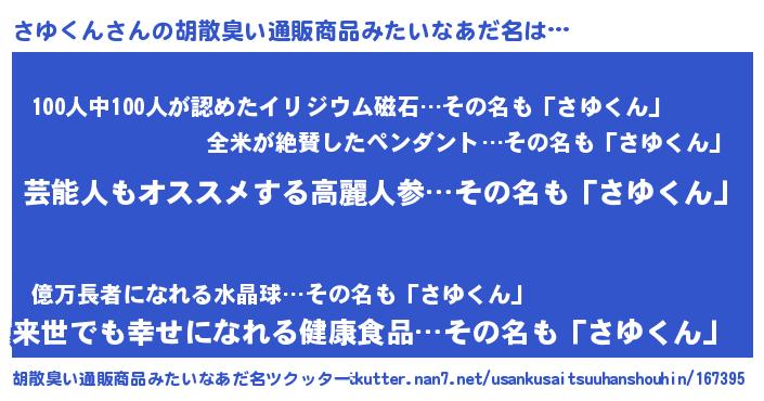 | 男性向けラノベタイトル風あだ名 | 『Re:さゆくんから始める異世界生活』 |