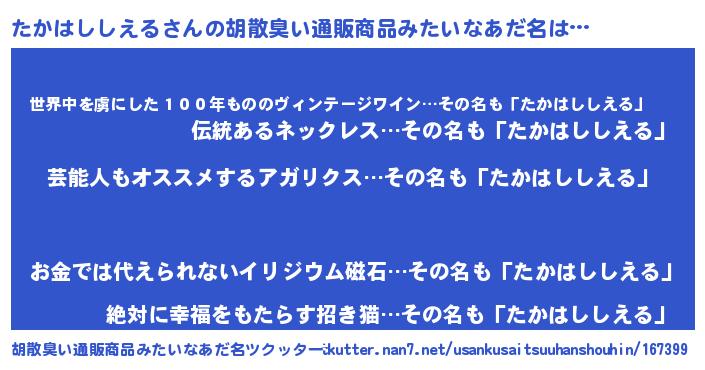 | 意味不明あだ名 | 『自称たかはししえる』 |