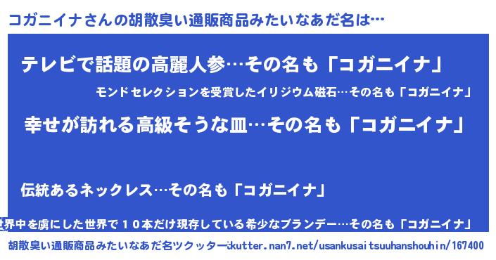 | 男性向けラノベタイトル風あだ名 | 『やはりコガニイナの青春ラブコメはまちがっている 』 |
