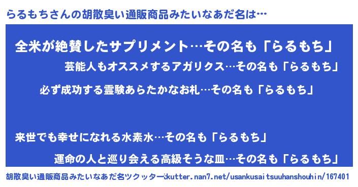 らるもちさんの胡散臭い通販商品みたいなあだ名をツクッター!