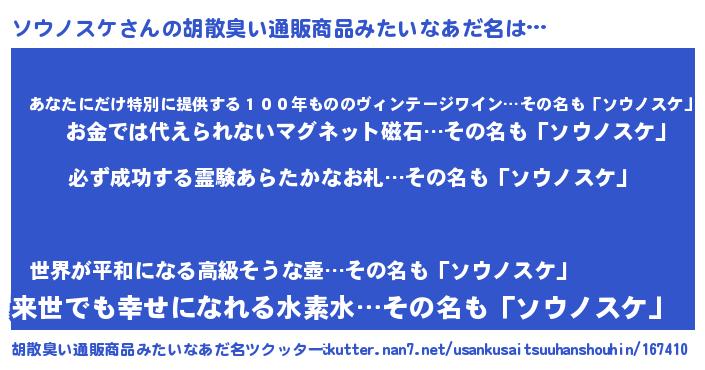 | ヘコむあだ名 | 『ソウっふぃ~』『ソウノスケ(震え声)』 |