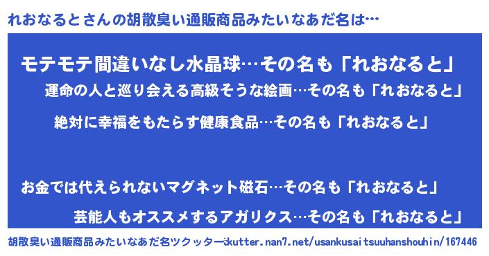 | 意味不明あだ名 | 『永久保存れおなると』『自称れおなると』 |