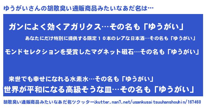 | ヘコむあだ名 | 『酢こんぶ』『ゆうがい(震え声)』 |