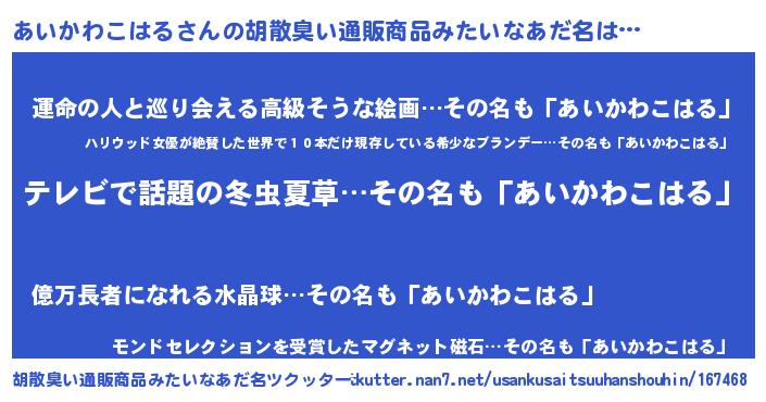 | 男性向けラノベタイトル風あだ名 | 『Re:あいかわこはるから始める異世界生活』 |