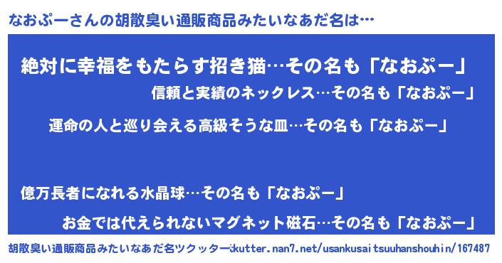 | 欧米人風あだ名 | 『なおぷークリステル』 |