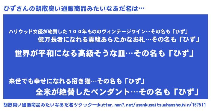 | 女子向けラノベタイトル風あだ名 | 『ひず伯爵の花嫁』『ひずの玉の輿計画!』 |