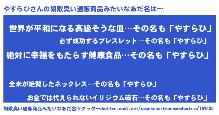 | ヘコむあだ名 | 『やすらひ(爆)』『牛乳』『やす太郎』 |