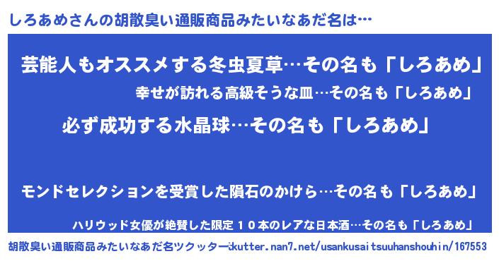 | 意味不明あだ名 | 『ペロリンしろあめ』『自称しろあめ』 |