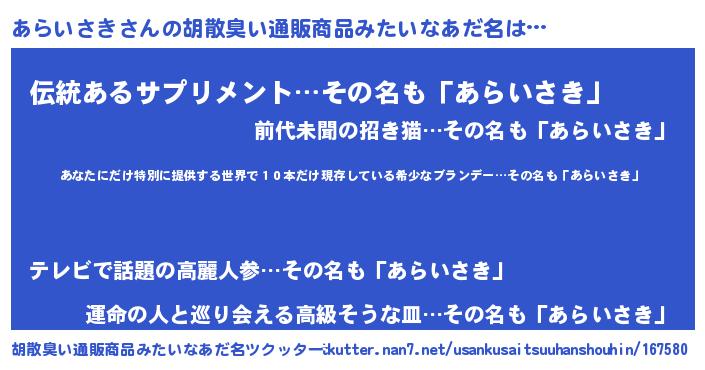 | 男性向けラノベタイトル風あだ名 | 『この素晴らしい世界にあらいさきを!』 |