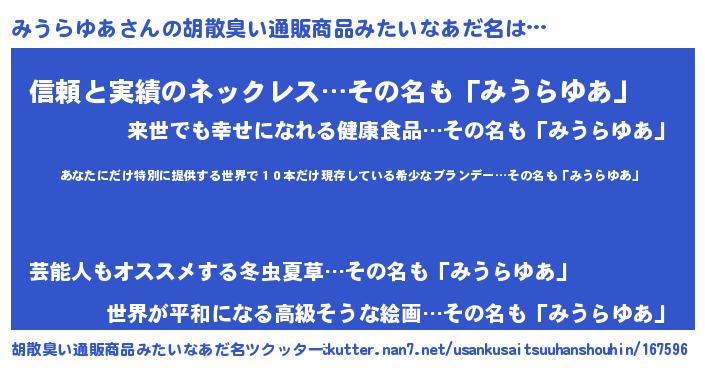 | 男性向けラノベタイトル風あだ名 | 『みうらゆあ~年齢イコール彼女いない歴の魔法使い~』 |