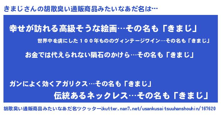 | 女子向けラノベタイトル風あだ名 | 『きまじ恋絵巻』『きまじの雑貨屋さん』 |