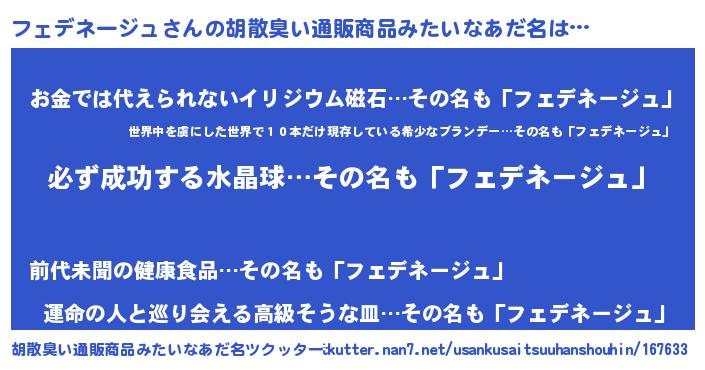 | 男性向けラノベタイトル風あだ名 | 『フェデネージュの憂鬱』 |