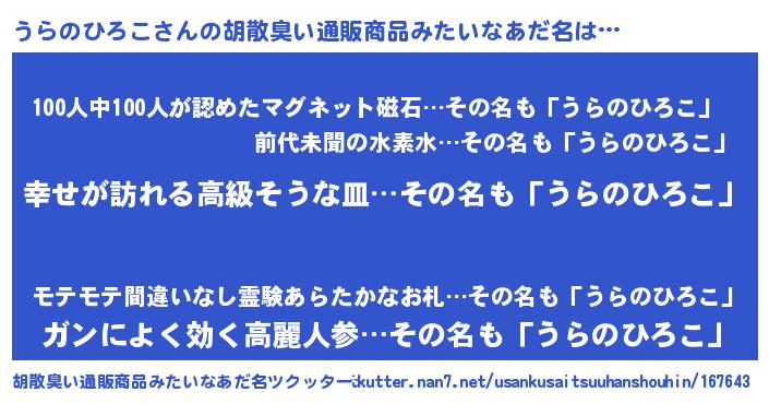 | 男性向けラノベタイトル風あだ名 | 『ウラノヒロコスレイヤー』 |