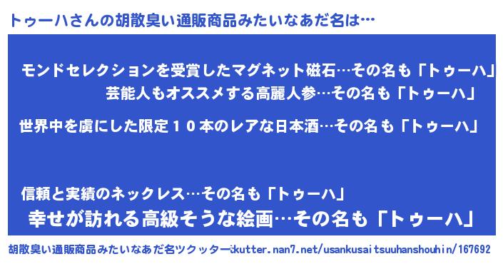 | 意味不明あだ名 | 『住所不定無職トゥーハ(47歳)』 |