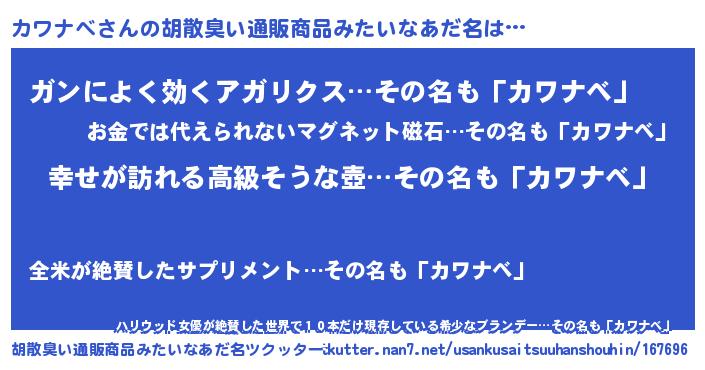 | 男性向けラノベタイトル風あだ名 | 『カワナベスレイヤー』 |