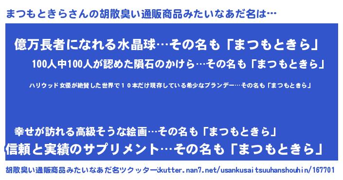 | 意味不明あだ名 | 『住所不定無職まつもときら(71歳)』 |