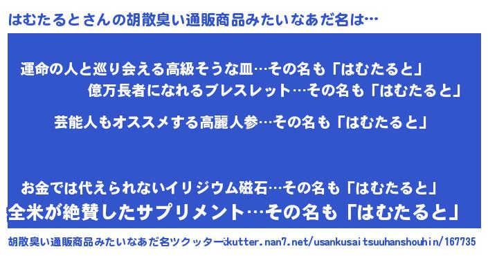 | 意味不明あだ名 | 『自称はむたると』『ニラ科はむたると属』 |