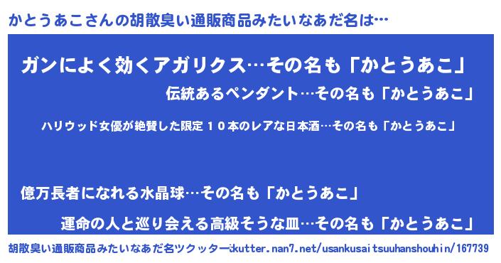 | 意味不明あだ名 | 『住所不定無職かとうあこ(40歳)』 |