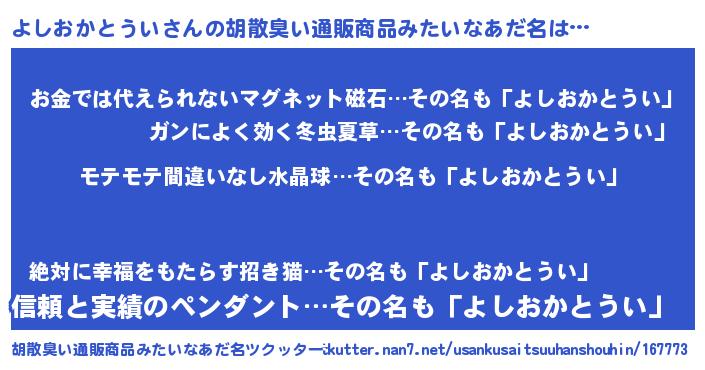 | 恥ずかしいあだ名 | 『プリティーよしおかとうい』『よしちん』 |