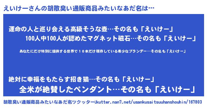 | 意味不明あだ名 | 『住所不定無職えいけー(85歳)』 |