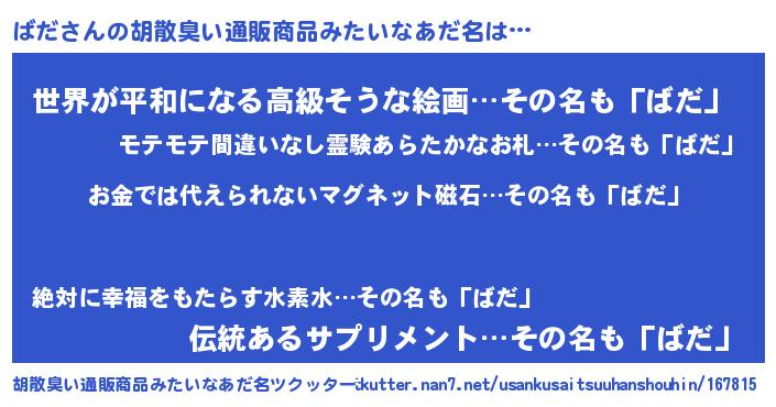 | ヘコむあだ名 | 『豆乳』『ばだを』『ばだにー』 |