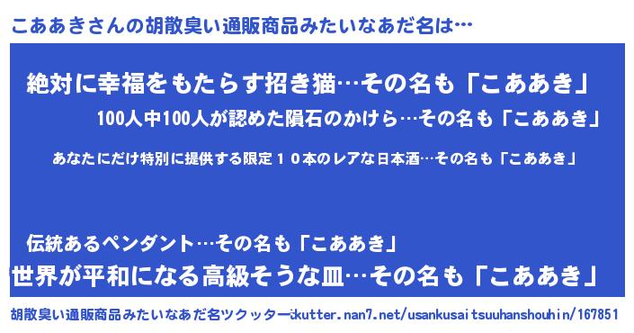 | 意味不明あだ名 | 『住所不定無職こああき(68歳)』 |