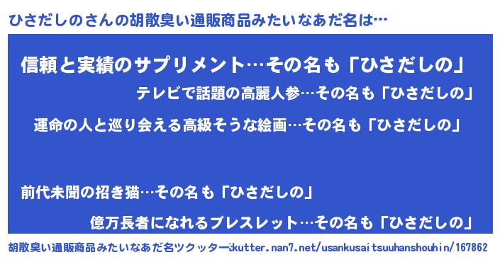 | 男性向けラノベタイトル風あだ名 | 『ひさだしのに滅ぼされるだけの簡単なお仕事です』 |