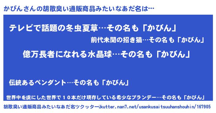 | 男性向けラノベタイトル風あだ名 | 『カビンアートオンライン』 |