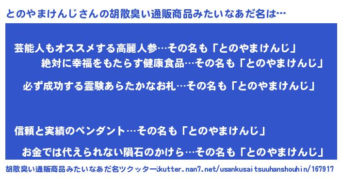 | 男性向けラノベタイトル風あだ名 | 『とのやまけんじの憂鬱』 |