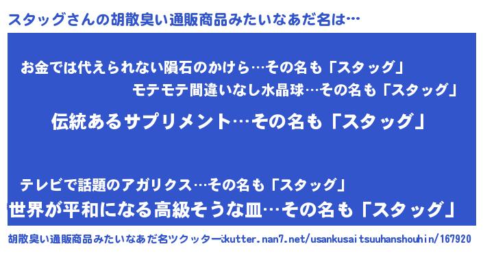 | 意味不明あだ名 | 『とにかく怪しいスタッグ』 |