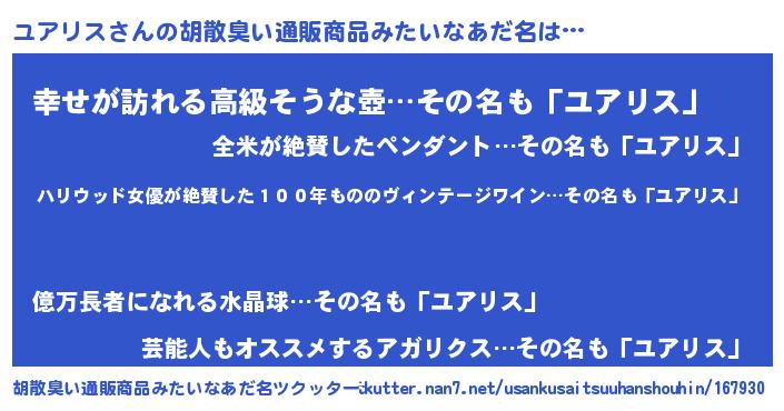| 意味不明あだ名 | 『住所不定無職ユアリス(12歳)』 |